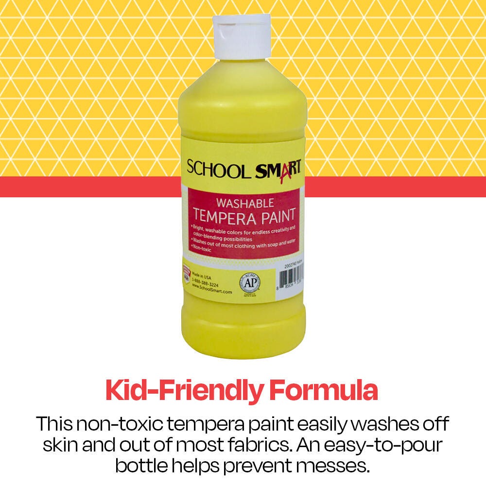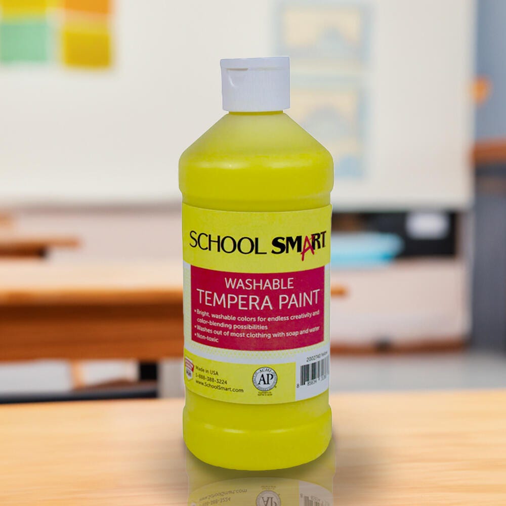 Description The School Smart washable tempera paint comes in a yellow color. This bottle of yellow tempera paint is great for classrooms, schools, art classes, and after school programs. The brilliant and rich opaque paint color offers students endless creativity and color blending possibilities. Our non-toxic tempera paint cleans up easily with soap and water and won't chip, flake, or crack when dry.