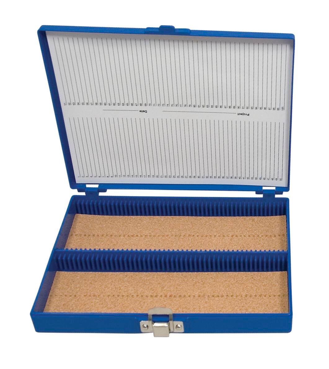 Heathrow Scientific Cork-Lined Plastic Slide Box is stackable and ideal for safe bench top storage. Molded and rigid box securely hold slides in numbered slots that correspond to the slide inventory sheet on the inside cover of the box. It allows you to store 100 slides. Color: Blue, Measures: 208 x 175 x 34 mm