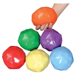 Yuck-E-Balls are made with the thickest, seamless skin, filled with 3/4-inch PVC balls and non-toxic gel. This combination of materials creates a fluid environment, within which the PVC balls glide easily when squeezed. They stop where dropped, making them a great alternative to beanbags. Each ball provides tactile feedback that encourages and sustains whole-hand manipulation making them ideal for use in juggling activities. Colors in set vary. Latex-free.Features