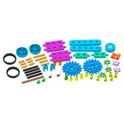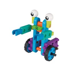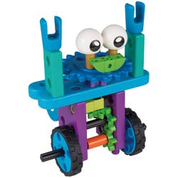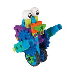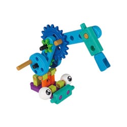 Read the funny story of two inquisitive kids, Ty and Karlie, and build simple, non-motorized models of the robots they construct and fix during their adventure to an automated candy factory. During this zany outing, Ty and Karlie build various robots to perform tasks and solve problems in the factory. The robots have moving parts, wheels, and gears, so kids can learn firsthand about simple machines and gear trains. As you follow the story, you can build models of the ten robots featured in the story. Large, colorful plastic building pieces make it easy for small hands to put the models together. In the story, the kids build robots with arms that rotate, turn, and spin. They fix a robotic arm and other specialized robots that complete specific tasks inside the factory. They construct a robotic drone that flies through the factory to coat the candies in sprinkles, wheeled robots that zoom across the factory floor, a taffy-pulling robot, and a funny gum-kneading robot. From each humorous segment of their silly adventure, the kids learn something new about robots and machines. This 53-piece science kit combined with the beautifully illustrated storybook provides an engaging way to teach simple engineering concepts to preschool-age kids. Start laying the groundwork for strong STEM related skills and comprehension. This kit helps develop fine motor skills, science and math skills, visual-spatial skills, and reasoning and concept development skills.Features