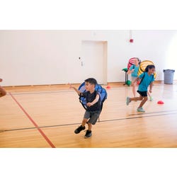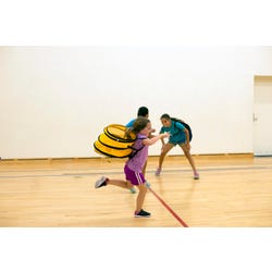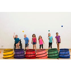 Pursuit Ball captures the constant movement elements of soccer and hockey with throwing elements of baseball and the basketball-like mobile baskets. In competition mode, teams try to put their team color balls into the other goal, while their goalie maneuvers to avoid them. With the six-color set, you can have three games of two teams running simultaneously or one giant six-team game. With their spring-steel, pop-up construction, the mobile goals make great six-color throwing targets. Set includes a detailed activity guide and 6 goals with 12 balls per goal (color coded to match). Colors include red, yellow, blue, green, purple, and orange. Games are suitable for elementary to middle school grades.Download Activity Guide