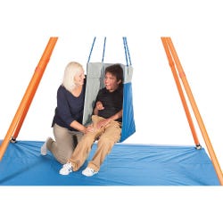 This soothing therapeutic swing can be used for a traditional swinging motion with the added comfort from surrounding pressure. Swing is designed for use with Haley’s Joy On the Go Swing Frame, Size 3, sold separately. Swing can be used on the dual linear hanging points or with an optional rotational swivel. The width of the seat at the bottom is 17 x 17 inches, the opening at top is 14 inches, and the length of the seat from bottom to top is 30 inches. Supports 300 pounds.Features