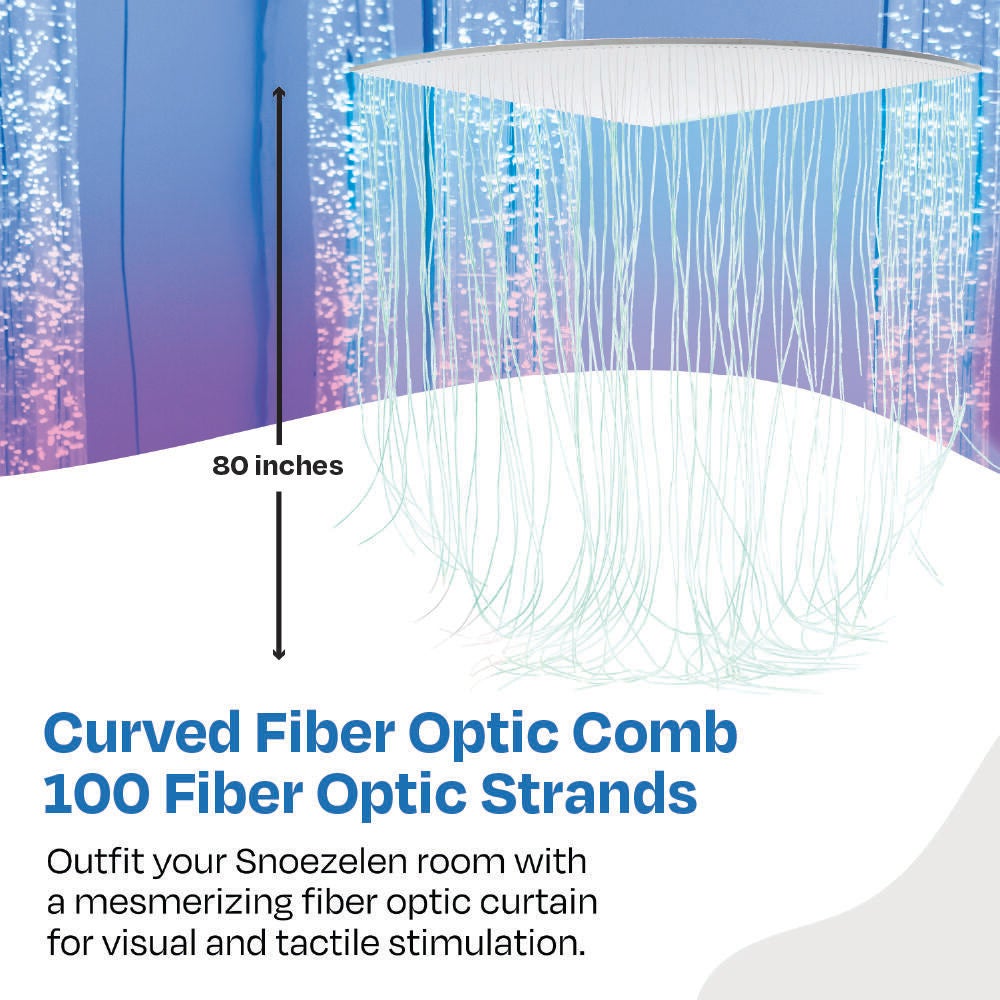 Description Create a soothing sensory space, starting with this Snoezelen Curved Fiber-Optic Comb. This Comb is designed to be wall-mounted, and can be used as a partition to separate different areas within your sensory space, care space, or playroom. Perfect for allowing those who need a moment of relief a separate space from those who need active engagement. Use this innovative device with your fiber-optic sprays to create spectacular, cascading waterfall effects! Includes 100 fiber optic strands, 80 L inches, but can be installed with fewer depending on the effect you prefer.