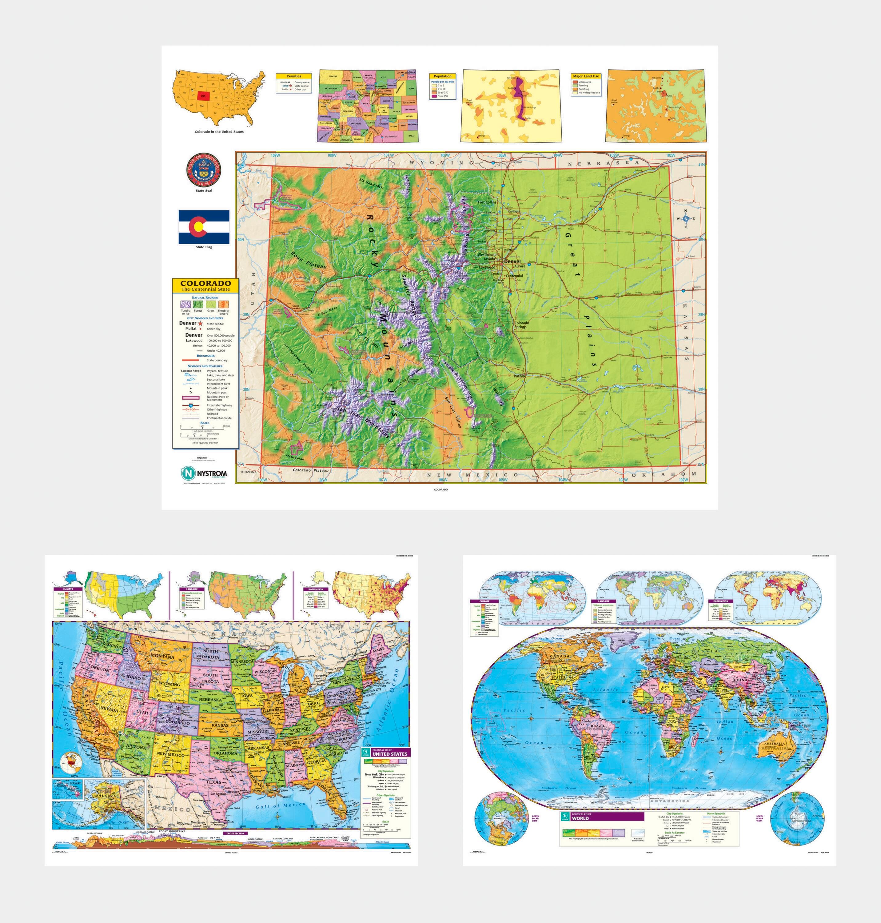 This large, colorful three-map set, mounted on a single roller, includes a state map, world map and United States map and is easy to read from across the room. The World and U.S. maps are political relief, with contrasting colors making countries and U.S. states immediately visible. The state map includes inset graphs and/or thematic maps providing information important to your state. The map set must be attached to the wall by means of a map rail or map rack (not included). Markable/erasable with water-soluble ink. Grades 4-12. Maps are 53 in H x 65 in W. Hardware to mount map is sold separately (1301145 for 1 Inch Map Rail or 285553 for 4-Map Rack).Features