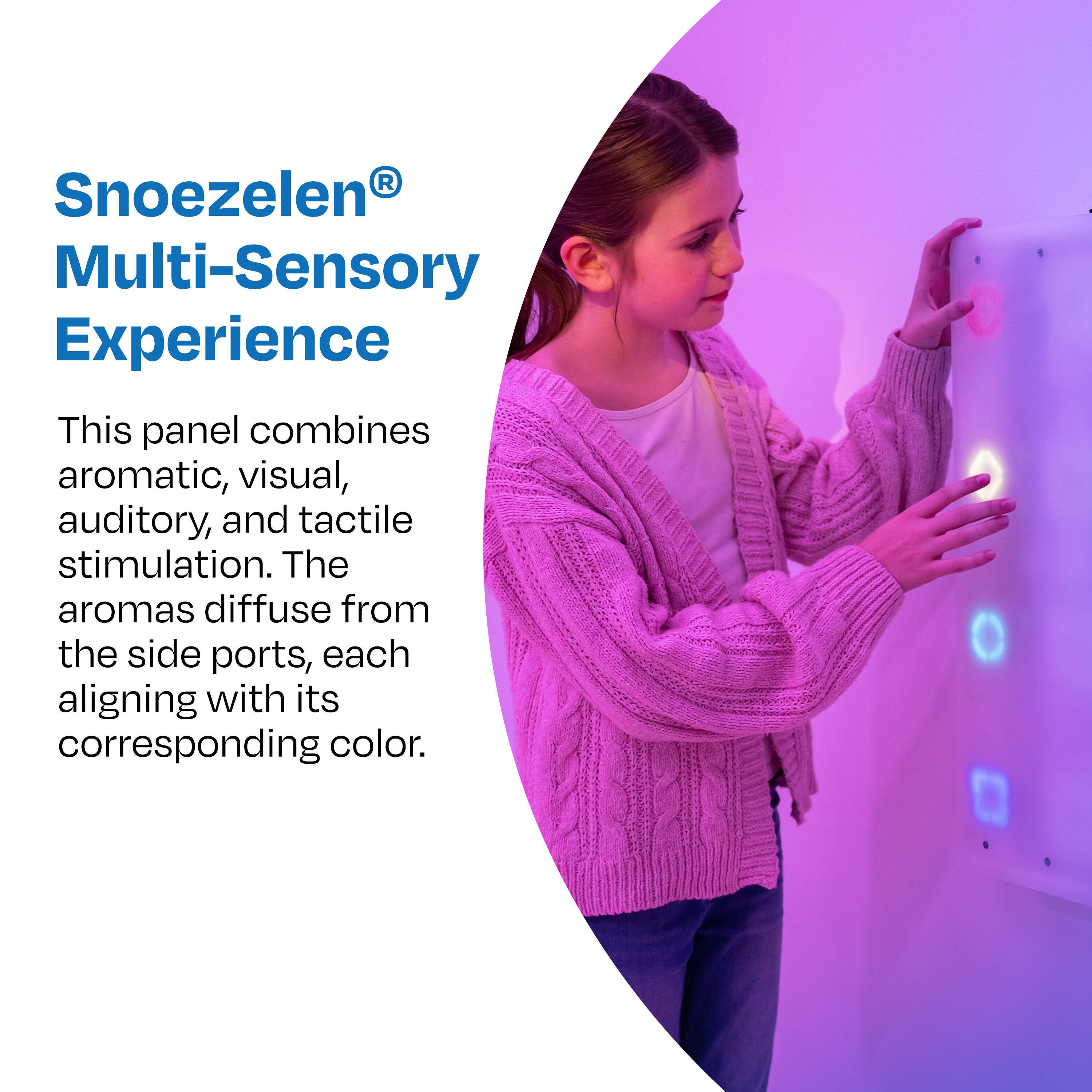 Snoezelen® Interactive Aroma Panel offers a unique multi-sensory experience that combines aromatic, visual, auditory, and tactile stimulation. Designed for interactive aroma exploration with guided LED light indicators, the aromas diffuse from the side ports, each aligning with its corresponding color. Whether wall-mounted vertically or horizontally, this panel is a versatile addition to any multi-sensory environment (MSE), supporting relaxation, focus, and engagement. The panel is designed for ease of use, with simple push-button controls. We offer multiple panel designs and sizes.