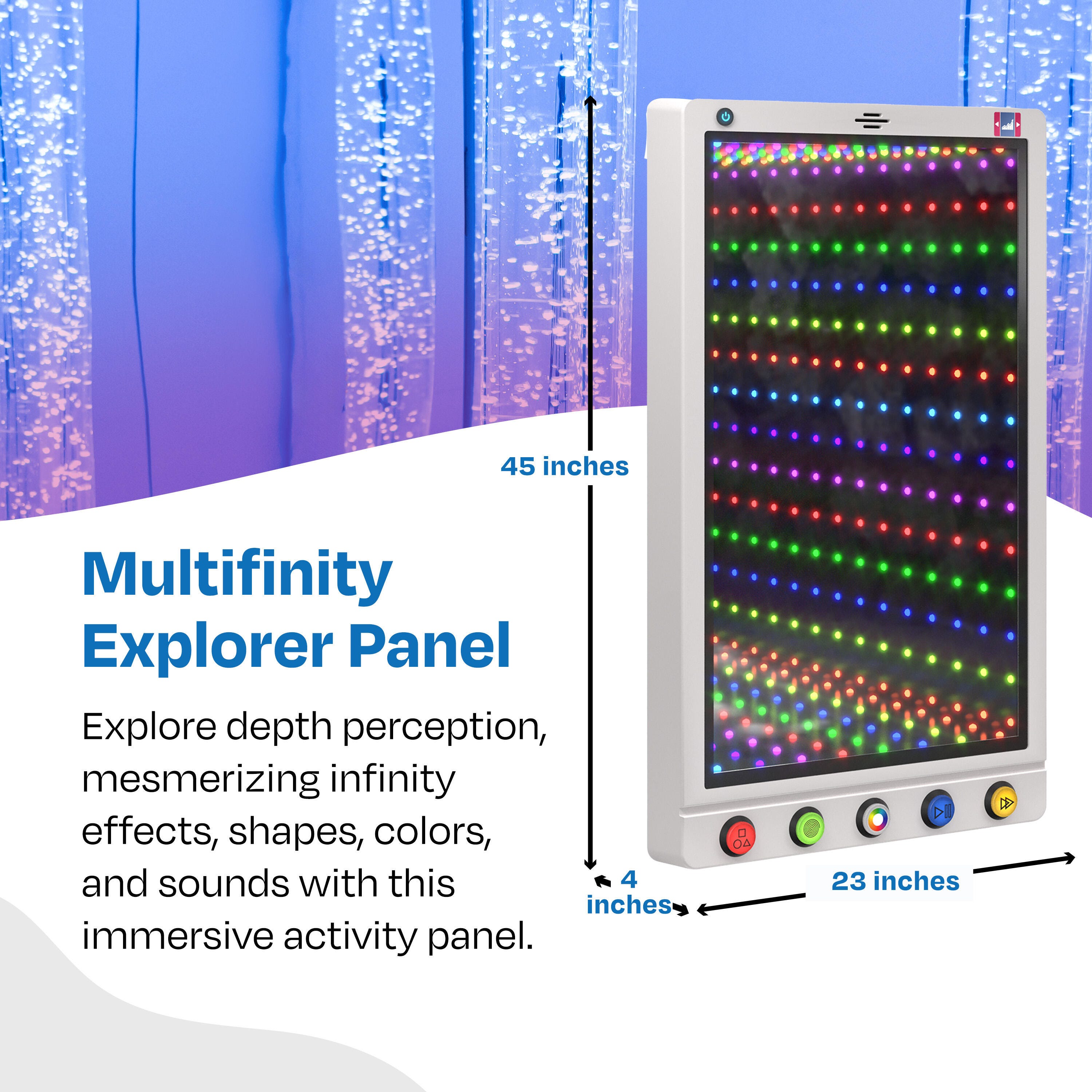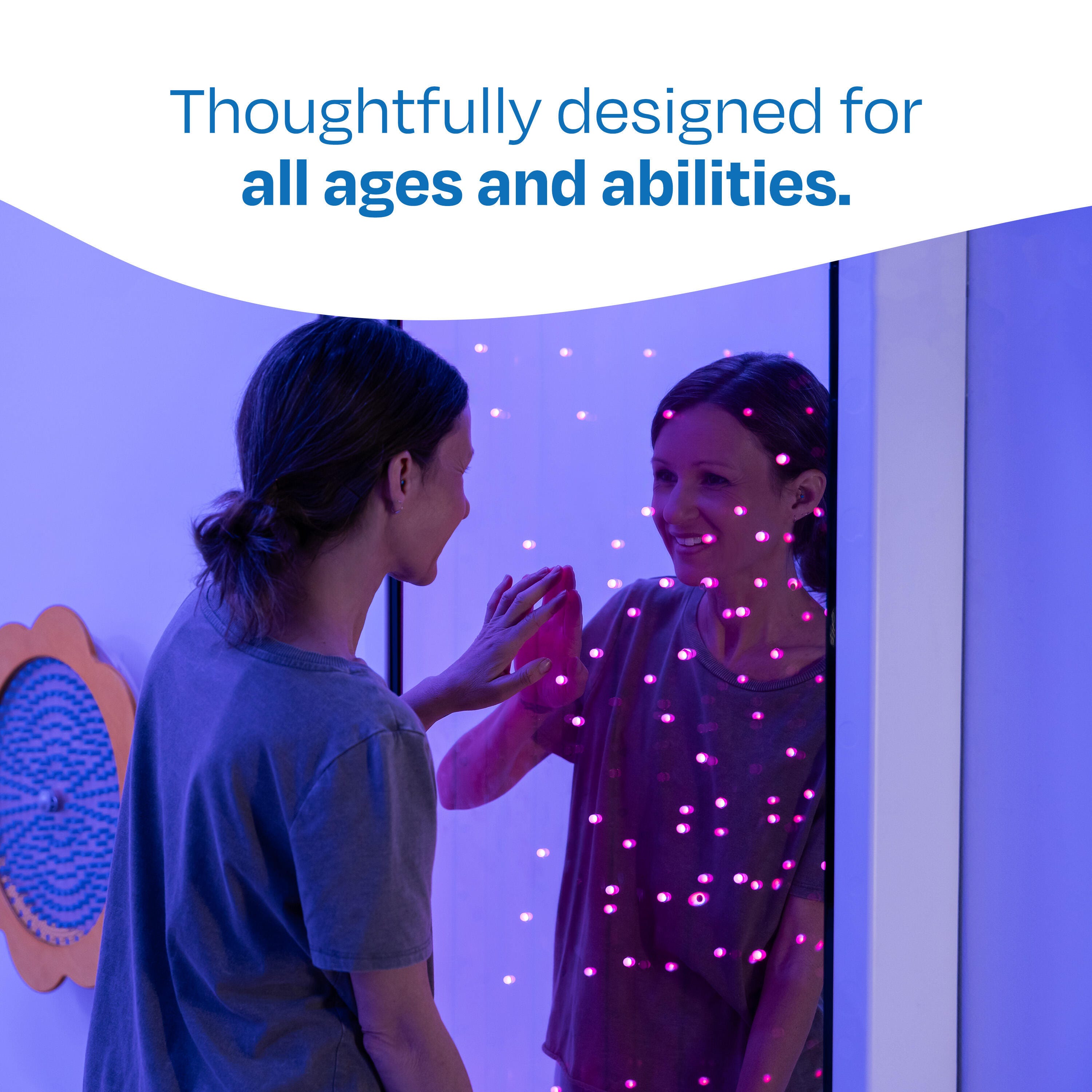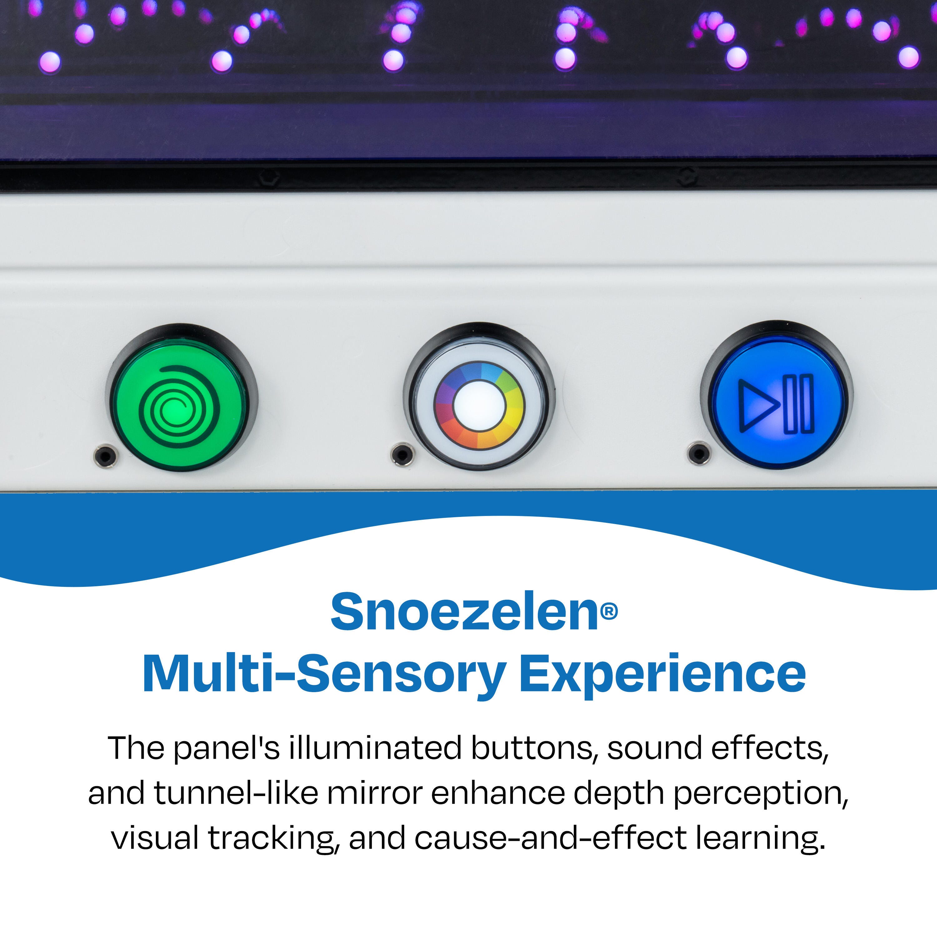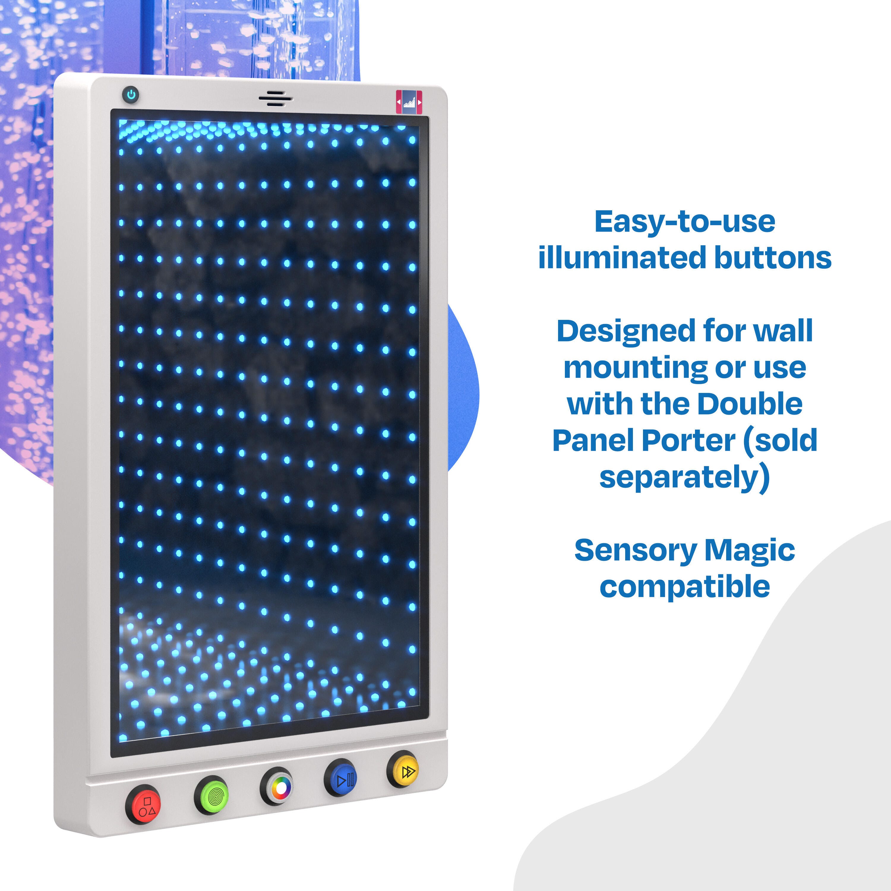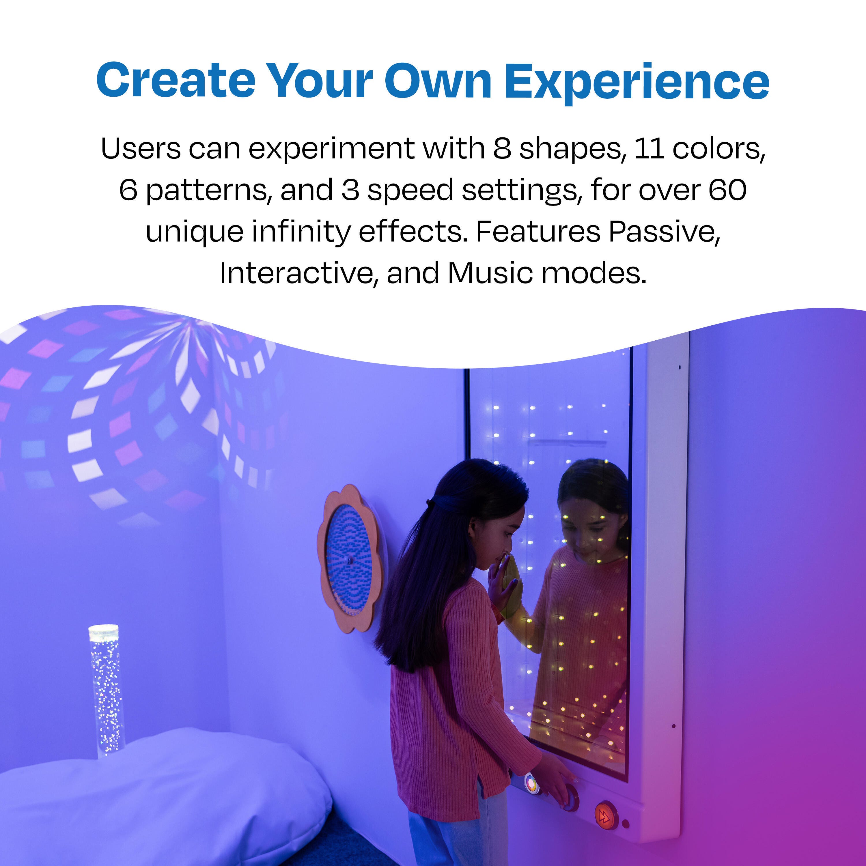 Snoezelen® Multifinity Explorer Interactive Panel offers an engaging visual and auditory experience, perfect for multi-sensory environments (MSEs). Users can experiment with 8 shapes, 11 colors, 6 patterns, and 3 speed settings, creating over 60 unique infinity effects. The panel features interactive illuminated buttons, sound effects, and a mirror surface that creates a captivating tunnel-like illusion, enhancing depth perception and encouraging visual tracking and cause-and-effect learning. Designed for inclusivity, the panel is compatible with adaptive switches and offers Passive, Interactive, and Music operation modes for versatile sensory engagement. This item is compatible with Snoezelen WiFi Wireless Controller item #2120147 (sold separately). We offer multiple panel designs and sizes. View the product brochure.