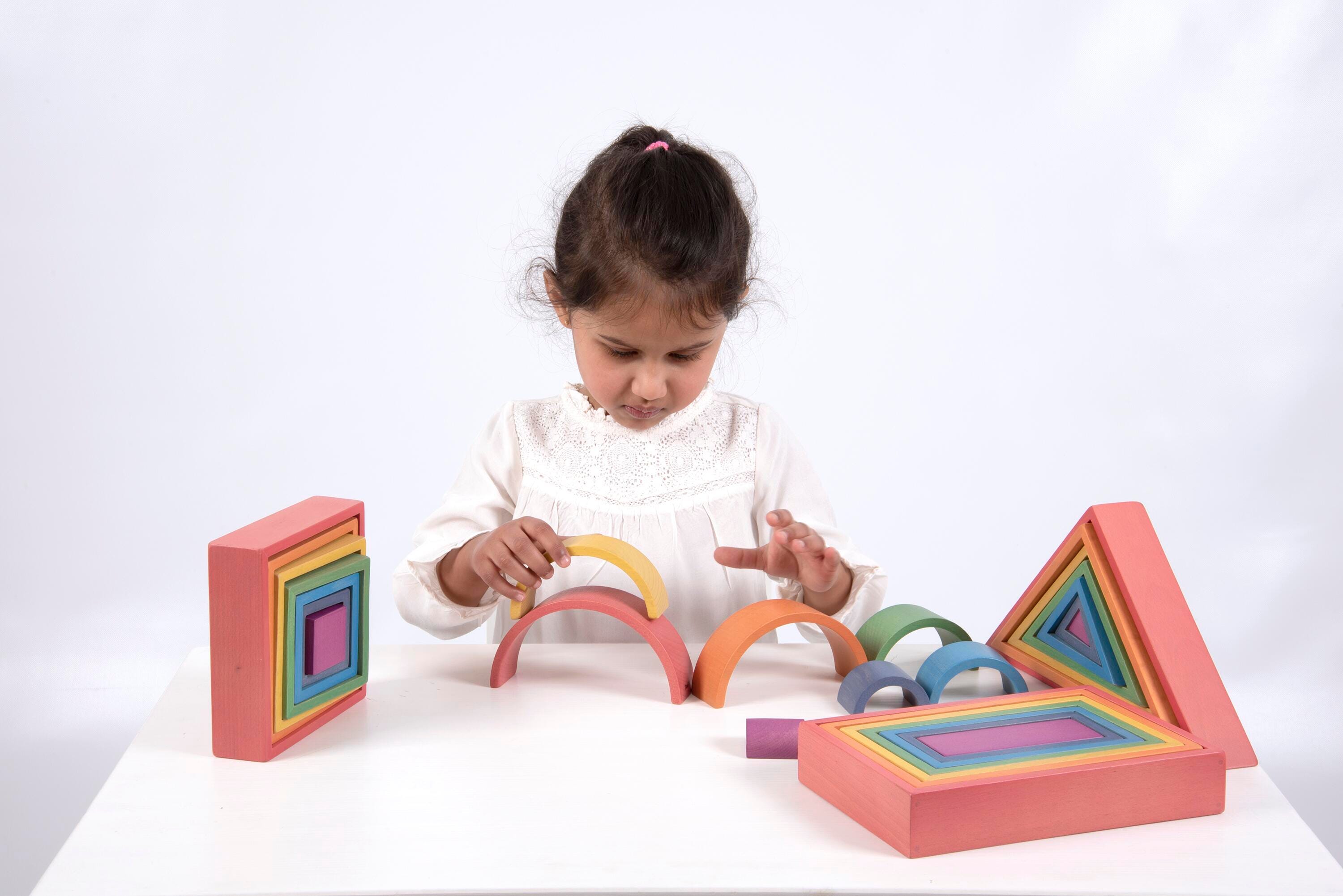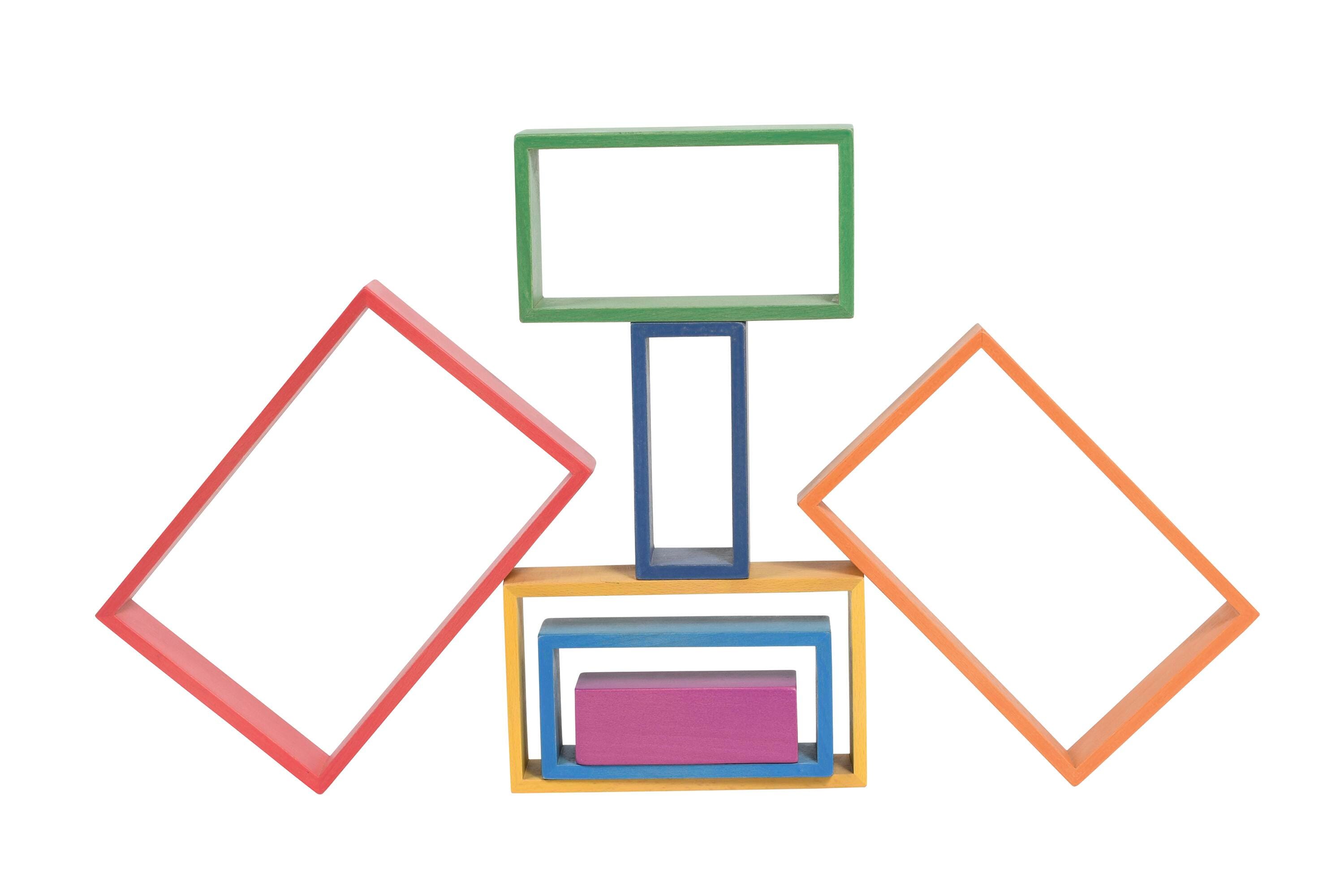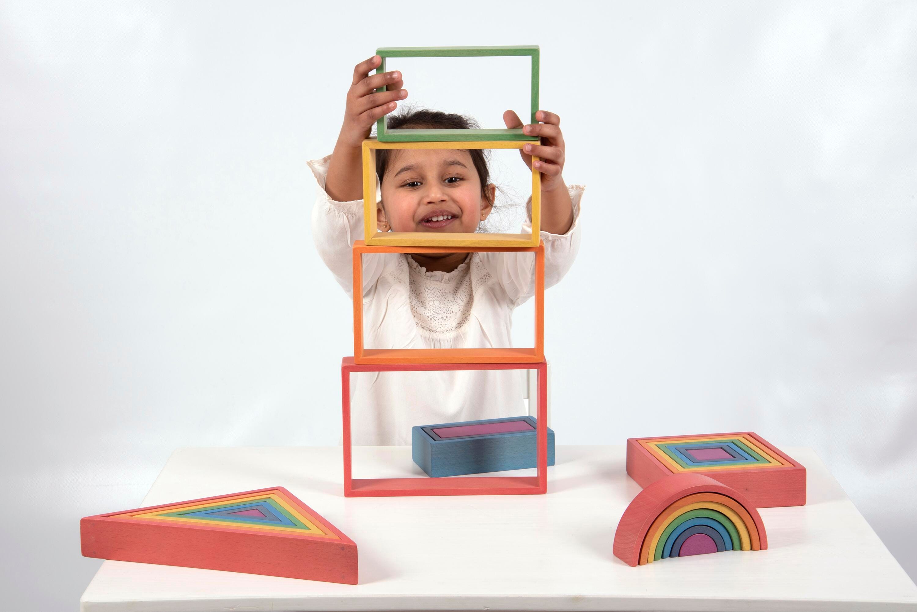 The 4 geometric shapes include squares, rectangles, triangles and arches for added shape recognition and built-in sorting exercise